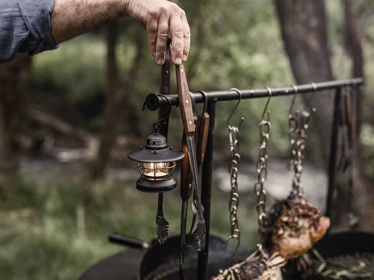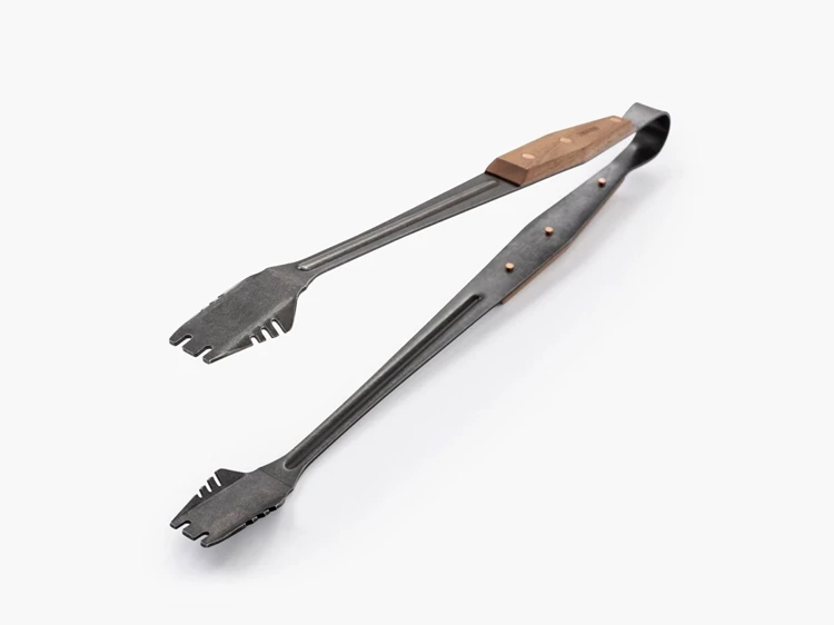Cowboy Cooking accessoires. Ontworpen om samen met u Cowboy Fire Pit Grill Systeem te gebruiken. Makkelijk op te hangen aan de accessoire organizer stang. Ontworpen met directe inbreng van de Barebones open fire chef partners. Met de hand gesmeed en bewerkt. Roestvast staal met zwarte afwerking.Koperen accenten. Walnotenhouten handgrepen.Extra lang om veilig te genieten.
