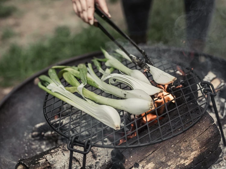 Fire Pit Grill Grate. Rond kampvuur rooster met inklapbare benen, ideaal om mee te nemen en/of te gebruiken in combinatie met de Cowboy Grill Charcoal Tray. Stevige stalen constructie. Inklapbare poten.