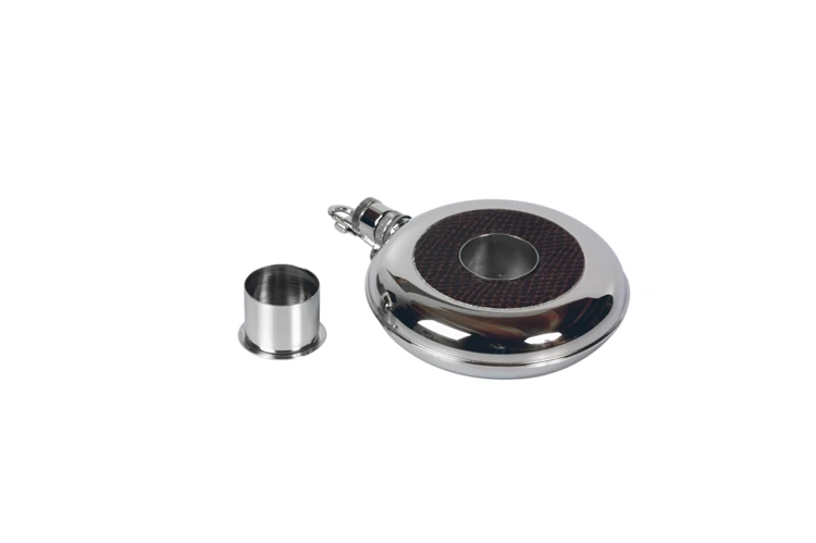 Gepolijst roestvrij staal met lederen inzet en een uittrekbare beker vanuit het midden.