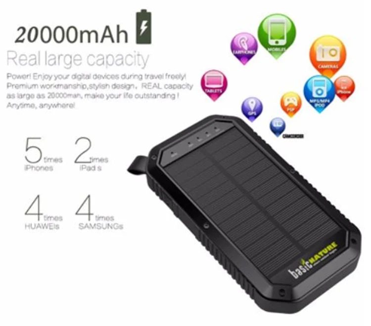 De Powerbank ’20’ biedt een capaciteit van 20.000 mAh. Tot 4-5 keer opladen van een smartphone is mogelijk. De extra functie Qi “draadloos opladen” maakt draadloos opladen via inductie mogelijk (alleen mogelijk met Qi-compatibele apparaten). De robuuste en spatwaterdichte behuizing beschermt de Powerbank tegen schade. De connectoren worden beschermd tegen spatwater en stof door een siliconen dop. Het apparaat kan worden opgeladen via Micro-USB of via zonne-energie (alleen voor noodgevallen). Bovendien is een helder LED-display met een brandduur van maximaal 15 uur ingebouwd. Een lus maakt het mogelijk om de powerbank in de tent op te hangen of overdag aan de rugzak te bevestigen, zodat de batterij kan worden opgeladen terwijl wandelen. Het statusdisplay geeft de geladen status in procent weer. De energie wordt opgeslagen in een hoogwaardige lithium-polymeerbatterij met een lange levensduur. Met laadkabel.