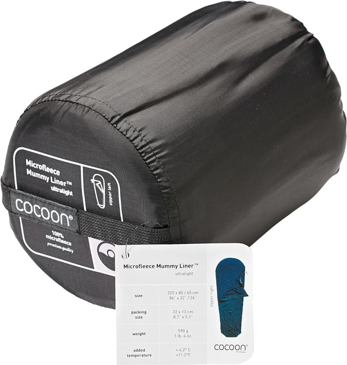 De Microcfleece Mummyliner van Cocoon is een zeer lichte mummyslaapzak gemaakt van microfleece. De gladde buitenzijde werkt vuilafstotend, waardoor je lakenzak langer schoon blijft. Deze microfleece lakenzak kan in je slaapzak worden gebruikt om je slaapzak warmer te maken of in warme gebieden los als een zomerslaapzak. De fijne microvezels voeren vocht snel af en drogen snel. Microfleece is daarmee zeer geschikt voor vochtige omstandigheden. Het hoofdeinde is voorzien van een capuchon, zo glijdt je kussen niet weg of kan je voor extra warmte de lakenzak strak om je hoofd heen trekken. De zijopening is voorzien van klittenbandsluiting. De naden zijn dubbelgestikt en de ruime opening is voorzien van versterkingen. Het vierkant-vormige voeteneinde zorgt voor meer bewegingsvrijheid. Voorzien van een dubbele ritssluiting waarmee tevens twee Microfleece Cocoon lakenzakken gekoppeld kunnen worden. Verkrijgbaar met rits aan de linker- of rechterzijde.
