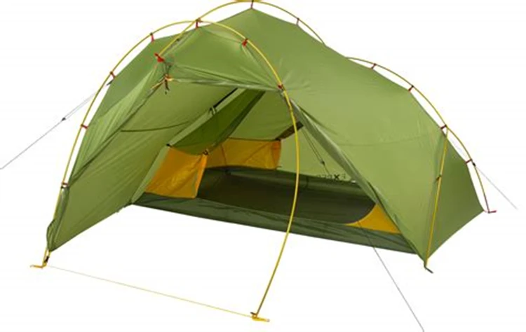 De Outer Space van Exped is een zeer slim ontworpen tent met een ruime voortent. De voortent is hoog en ruim genoeg om twee lichtgewicht kampeerstoeltjes te kunnen gebruiken. De voortent kan helemaal weg worden gerold. Zo kan je uit de wind zitten en heb je toch ruim uitzicht.Naast de ruime voortent, heeft de tent nog een extra uitgang aan de achterzijde. Ideaal omdat de binnentent een zogenaamde ‘dwarsslaper’ is. Dankzij de tweede uitgang hoef je ’s nachts niet over elkaar heen te kruipen als je er even uit moet.OpzetgemakDe tent is zeer snel op te zetten doordat de stokken aan de buitenzijde met clips aan het buitendak worden bevestigd. De binnentent zit direct aan de buitentent vast, deze staat gelijk. Mocht de tent bij nat weer worden ingepakt dan kun je eerste de binnentent eruit halen en deze alvast droog inpakken, voordat je de buitentent afbreekt.De binnentent is aan de bovenzijde voorzien van mesh voor gewichtsbesparing en ventilatie. Aan beide hoofdeinden zijn zakjes van mesh om bijvoorbeeld je hoofdlamp op te bergen. Voor extra ventilatie zijn de ritsen in het buitendak met dubbelle lopers uitgevoerd. Door de bovenste loper iets naar beneden te trekken en deze open te zetten met het foam versterkte uithoudertje, creeër je extra doorstroming.Een zeer doordachte tent, ideaal voor de fietskampeerder.