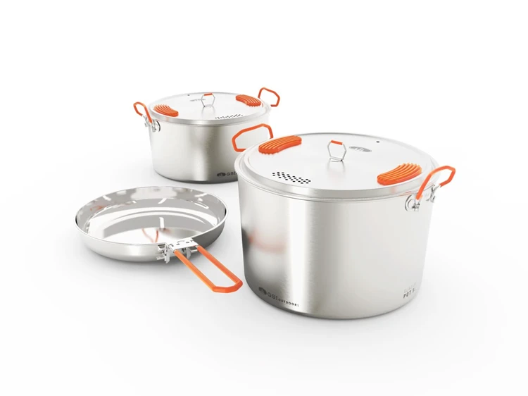De GLACIER STAINLESS Camper Large van GSI Outdoors is een compacte en flexibele kookset. Door delen thuis te laten of mee te nemen is deze set geschikt te maken voor een 2 backpackersavontuur, fietstocht tot en met 4 persoons autokampeertochten.Door middel van de handige deksels kan je de etenswaren in de geisoleerde pannen goed warm houden. De pannen hebben een laag zwaartepunt waardoor deze stabiel staan, zelfs op een ongelijk oppervlak.De deksels zijn onbreekbaar en hitte bestendig. De in de deksel geïntegreerde vergiet maakt afgieten erg gemakkelijk. De pan is op de bodem voorzien van een spiraal-reliëf. Hierdoor blijft de pan stabiel op de brander staan.Geleverd in handige foedraal, die tevens te gebruiken is als afwasteiltje.