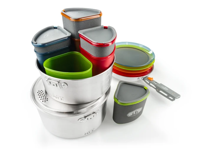 De GLACIER STAINLESS Camper van GSI Outdoors is een compacte en flexibele kookset. Door delen thuis te laten of mee te nemen is deze set geschikt te maken voor een 2 backpackersavontuur, fietstocht tot en met 4 persoons autokampeertochten.De pannengreep haakt in op een bevestigingspunt aan de buitenzijde. Dit levert een stevige greep op en voorkomt beschadiging van de rand van de pan. De pannengreep is dubbel te vouwen en neemt zo minder plaats in.Door middel van de handige deksels kan je de dranken in de geïsoleerde bekers en kommen goed warm houden. De beker en kom hebben een laag zwaartepunt waardoor deze stabiel staan, zelfs op een ongelijk oppervlak.De deksels zijn onbreekbaar en hitte bestendig. De in de deksel geïntegreerde vergiet maakt afgieten erg gemakkelijk. De pan is op de bodem voorzien van een spiraal-reliëf. Hierdoor blijft de pan stabiel op de brander staan.Geleverd in handige foedraal, die tevens te gebruiken is als afwasteiltje.