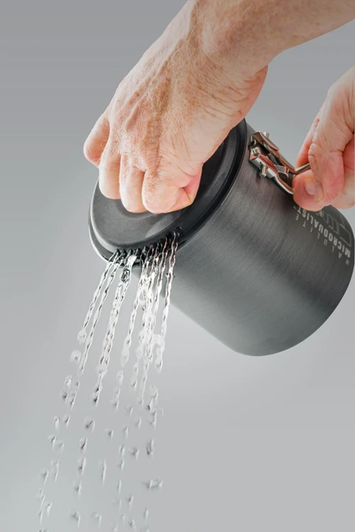 De Halulite MicroDualist van GSI Outdoors is een praktische en complete twee-persoons kookset. De verschillende onderdelen passen slim in elkaar en nemen zo weinig ruimte in. Het handvat is inklapbaar en word tevens gebruikt als sluiting van de deksel tijdens het transport van de pan. Door middel van de handige deksels kan je dranken in de geïsoleerde beker en kom goed warm houden. De beker en kom hebben een laag zwaartepunt waardoor deze stabiel staan, zelfs op een ongelijk oppervlak.Het formaat van de pan is zo gekozen dat er precies een 110 grams gasblikje in opgeborgen kan worden. Tevens bestaat de mogelijkheid een brander in de kookset op te bergen in het meegeleverde opbergzakje. Brander en gasblikje worden niet mee geleverd.Geleverd in handige foedraal, die tevens te gebruiken is als afwasteiltje. HaluliteHalulite is een krasvast materiaal, voorkomt zogenaamde hotspots en is zeer licht. Deze aluminium legering is net zo licht als titanium, maar geleidt warmte beter en gelijkmatiger. Dit bespaart brandstof tijdens het koken. Het aluminium wordt eerst gevormd en vervolgens geanodiseerd, zo ontstaat een kras- en slijtage bestendig oppervlak dat tegen een stootje kan.