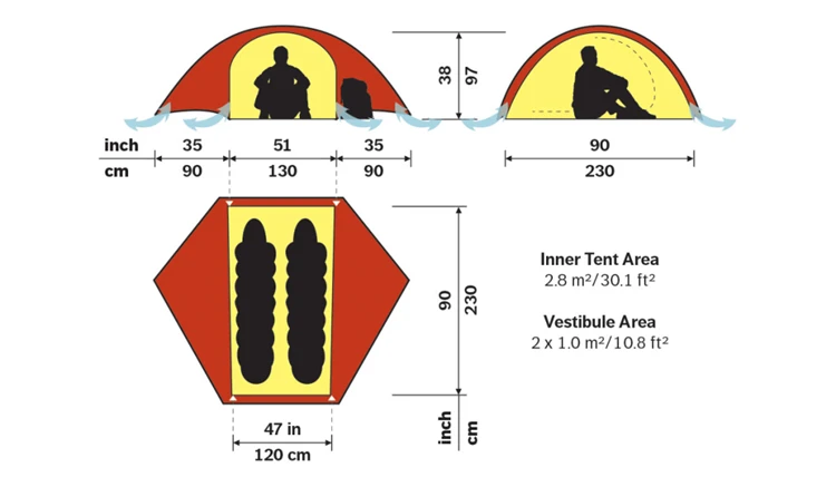 Twee kruispunten van gelijke lengte creëren de basisvorm, en een kortere paal in het dak biedt vestibule hoofdruimte en draagt bij aan de algehele stabiliteit. Palenmouwen met enkele opening zorgen voor een snelle pitching, en bovenleidingen in de bodem van de buitenste tentwanden zorgen voor constante ventilatie. De deuren van de binnentent zijn allemaal van gaas voor een volledige luchtstroom en beide vestibules kunnen worden opgerold voor extra ventilatie.