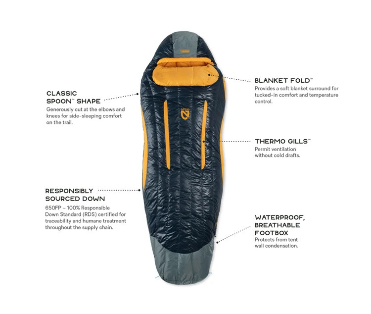 Disco blijft regeren als de ideale donzen rugzak voor zijslapers en biedt het hoogst mogelijke comfort op de tocht. Zeventig procent van alle mensen slaapt op hun zij, daarom heeft NEMO de iconische Spoon™ Shape tas ontworpen om de balans tussen comfort en draagbaarheid te verfijnen. De Classic Spoon™ vorm is de sweet spot van de serie, met een ruime snit bij de ellebogen en knieĂ«n zodat slapers gedurende de nacht comfortabel van positie kunnen veranderen. (Zelfs met het ruimere silhouet is deze tas opmerkelijk klein op te vouwen.) Premium 650 FP hydrofoob, RDS-gecertificeerd dons zorgt voor traceerbaarheid in de hele toeleveringsketen en biedt superieure warmte voor koude nachten. Deze 3-seizoenen rugzak zit vol met functies, waaronder Thermo Gill™ ventilatieopeningen die de temperatuur ’s nachts helpen reguleren, een Blanket Fold™ tochtkraag die zorgt voor ingestopt comfort, en een waterdichte/ademende voetenzak die bestand is tegen tentcondensatie. Met de ritsen aan de linkerkant bij de heren en aan de rechterkant bij de dames kunnen twee Discos aan elkaar geritst worden voor een dubbele versie van deze favoriete slaapzakken.