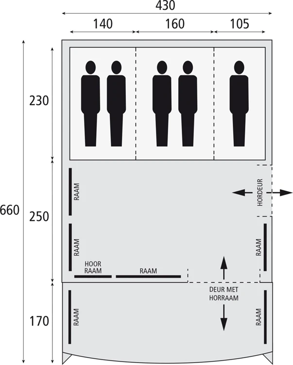 Zowel de buitentent als de binnentent zijn gemaakt van ademend technisch katoen. Het PE kuipgrondzeil is neerklapbaar en inritsbaar. De deuren hebben extra zware 10 mm ritsen en de tent heeft een volledige horrengaasdeur.